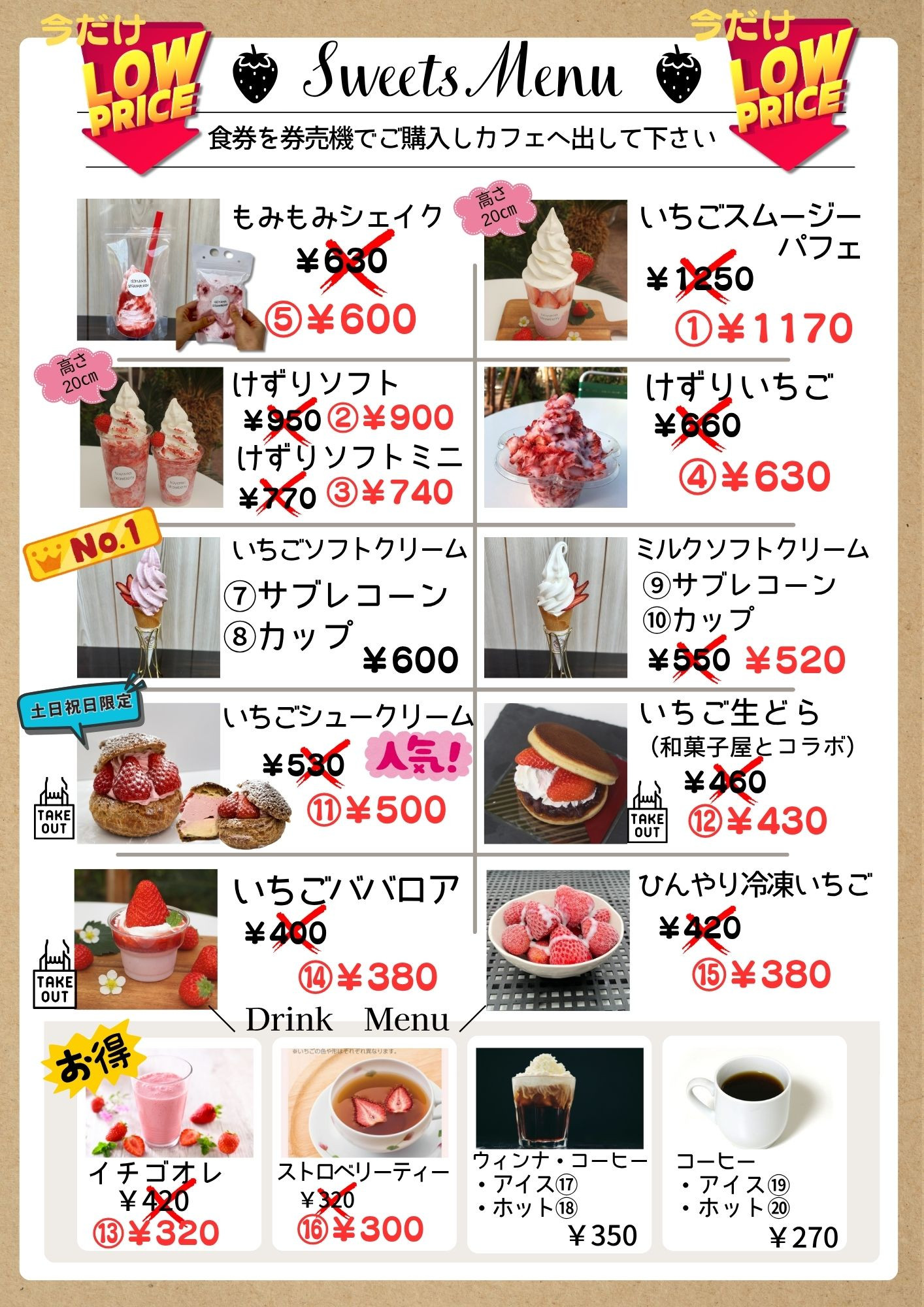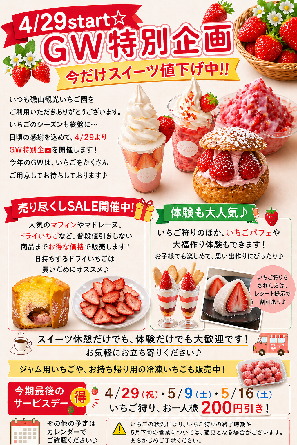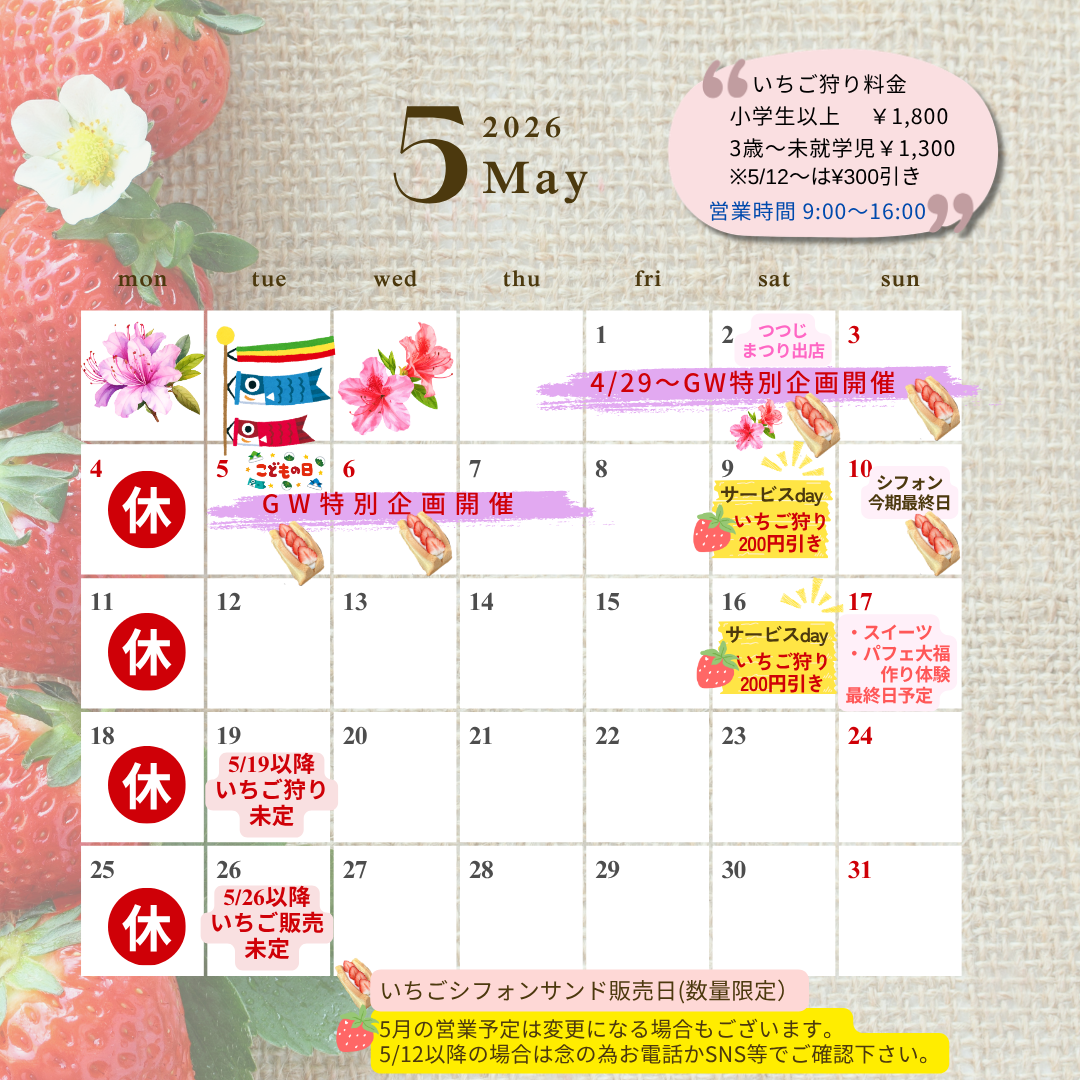 | 営業時間について | 営業時間内でも、いちご狩りと販売用のいちごは当日分がなくなり次第終了となります。 売店とスイーツは16時まで営業します。 |