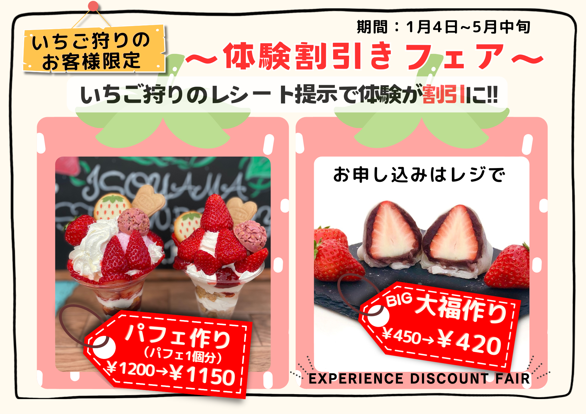 | お支払方法 | 当日、売店内レジにてお支払いください。 いちご狩りのレシートをお持ちのお客様は割引が受けれますので忘れずに提示下さい。 |