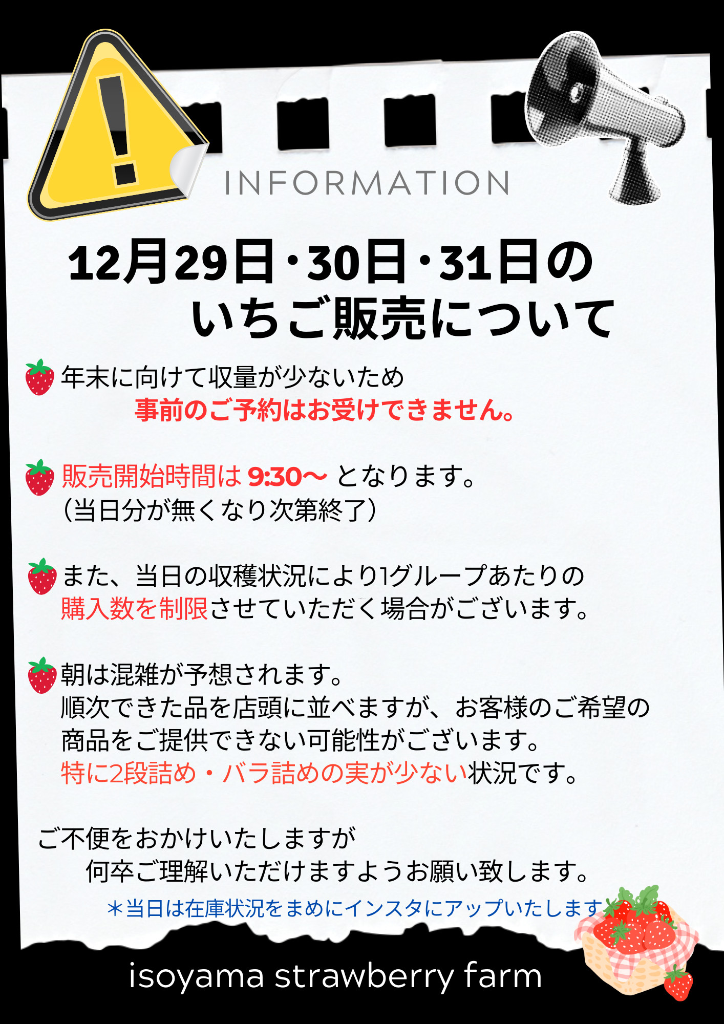 12/29日・30日・31日のいちごの販売方法が決定致しました。