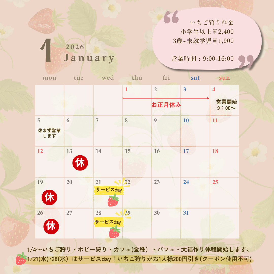 1月は2日間で21日と28日の水曜日をサービスデーとし個人のお客様限定で、いちご狩り料金をお一人様200円引きに!