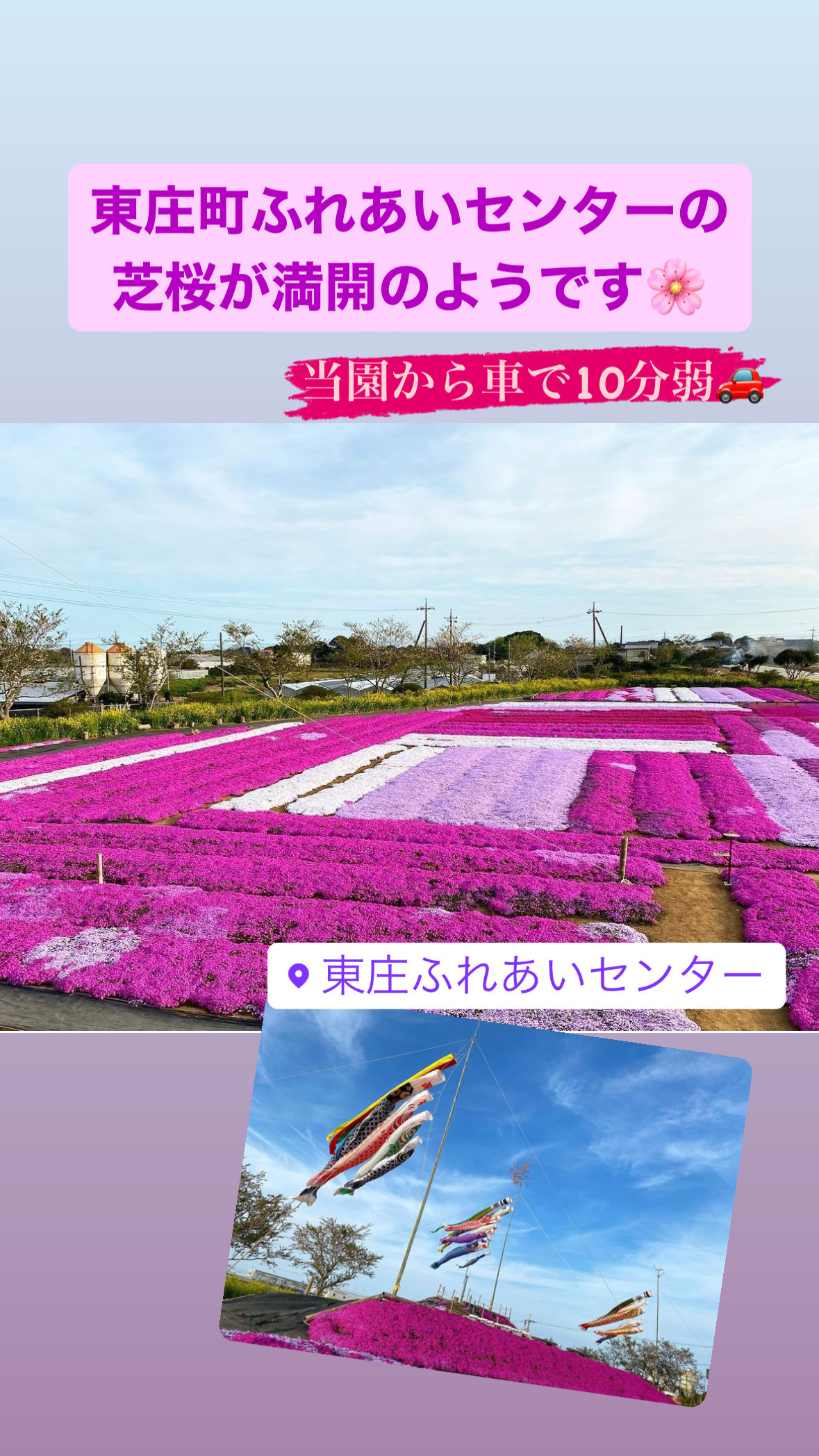 当園から車で10分弱の所にある、東庄ふれあいセンターの芝桜が今年も咲き始めました。